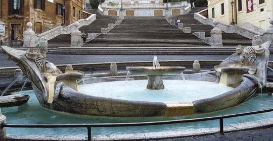 L’acqua straripante dai fianchi della barca, aperti in modo da offrire l’impressione che stia affondando, viene poi ulteriormente raccolta in un bacino sottostante nel quale confluiscono anche i getti provenienti da bocche di finte cannoniere poste all’esterno della prua e della poppa, ai lati dei grandi stemmi papali caratterizzati dalle api, simbolo della famiglia Barberini.