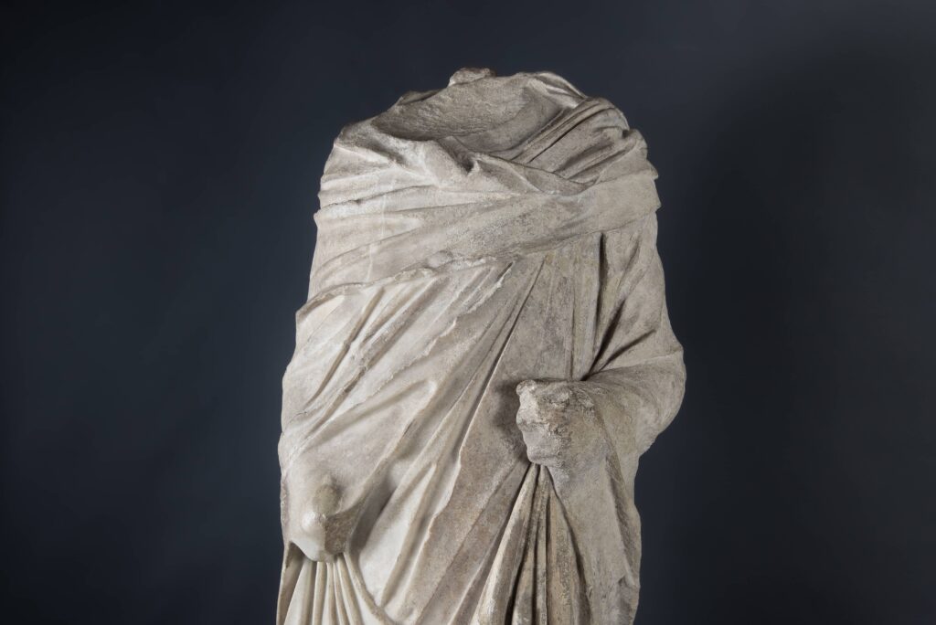 Sempre nel complesso archeologico è esposta una figura femminile, priva di testa e mani. In questo caso, un elemento fondamentale per l’interpretazione è l’himation, un ampio drappo rettangolare (noto anche come pallium) utilizzato come mantello e caratteristico dell’abbigliamento formale romano. La tunica sottostante, purtroppo non conservata, avrebbe fornito indicazioni cronologiche ancora più precise, poiché soggetta a maggiori variazioni nel tempo. Tuttavia, le donne romane di rango rispettabile erano raramente rappresentate senza mantello, e l’arte antica privilegia l’abbigliamento cerimoniale. Le dimensioni del drappeggio suggeriscono una datazione alla fine del II secolo d.C.
