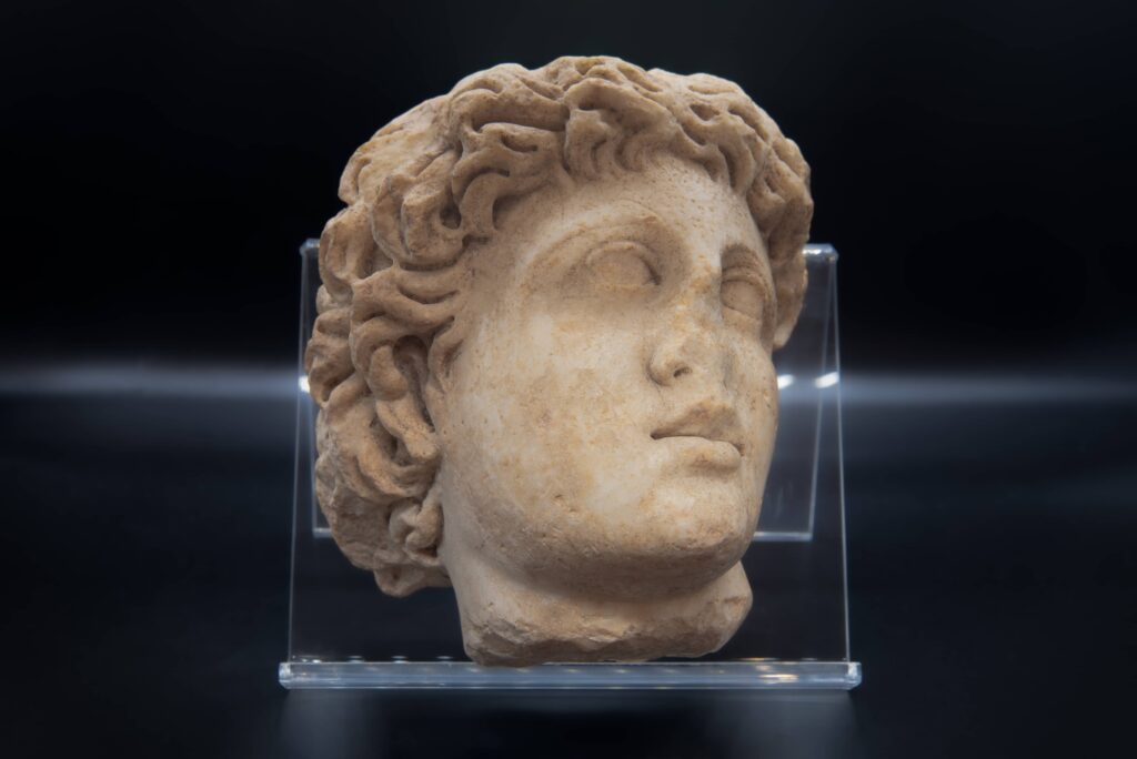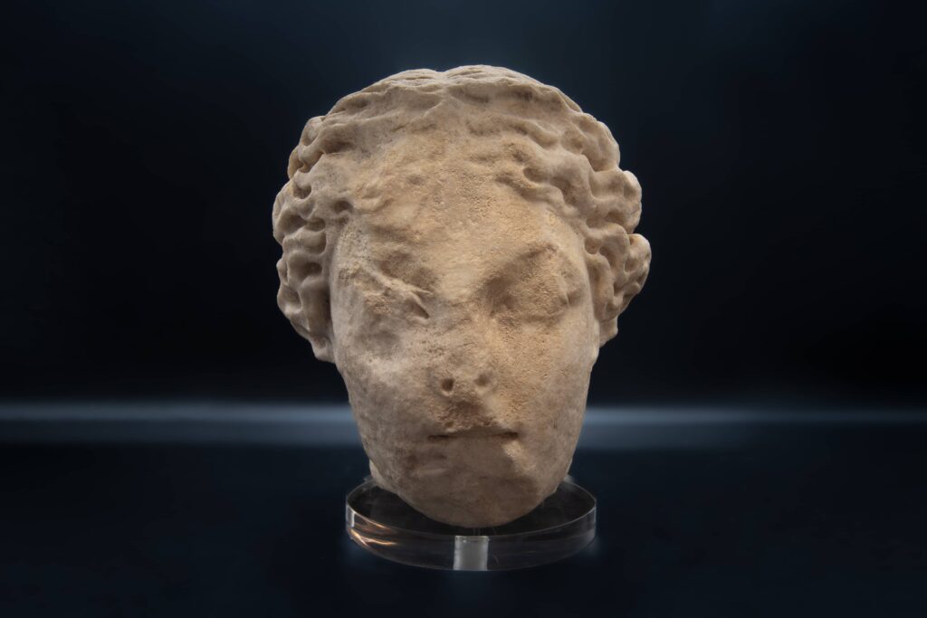 Un’altra scultura rinvenuta nel corso degli scavi del Vicus Caprarius raffigura un giovane uomo con una folta capigliatura riccia. Se le donne ricorrevano a parrucche e tinture, le acconciature maschili nell’antica Roma dipendevano molto spesso da fattori naturali. Non sorprende, quindi, che i ritratti ufficiali di Augusto lo mostrino eternamente giovane fino alla sua morte!